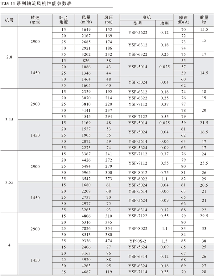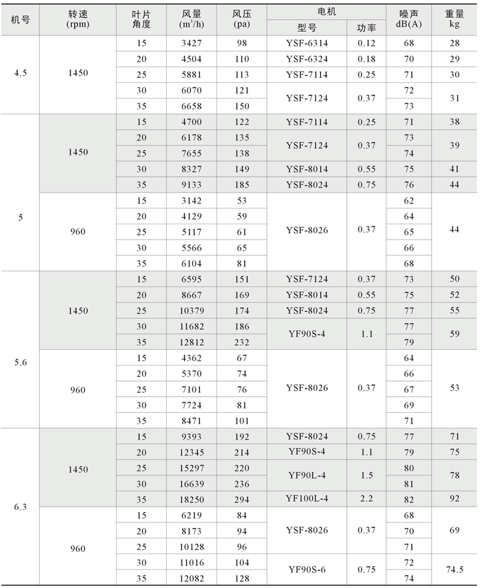 本系列風機葉輪直徑由小到大共有十三個規(guī)格,每一規(guī)格風機的葉片數(shù)都為4片。