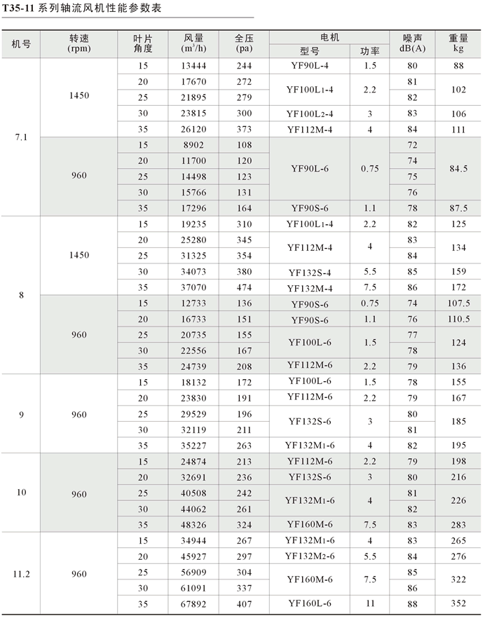 T35-11系列軸流風機是我國八十年代在30-11的基礎(chǔ)上改進設計的新型風機,它與30-11風機相比具有明顯優(yōu)點:①結(jié)構(gòu)更合理:輪轂圓筒形,減少流動損失,葉片根部強度高;②性能有較大的提高;全壓效率為89.5%,噪聲(比A聲級)降低3.6dB(A)。